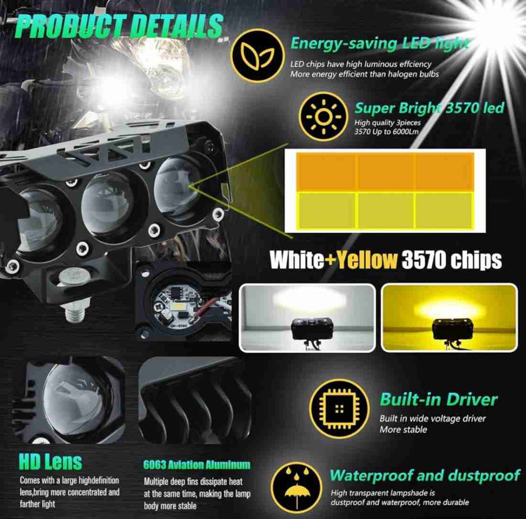 دارای 2 حالت نوری پر قدرت ، سفید برای نور بالا و زرد یا لیمویی برای نور پایین با سیم های مجزا ، 3 سیم ، خط کات صاف و یکنواخت ، پرتاب نور بسیار بالا ، شعاع پخش نور فوق العاده که دید بسیار عالی و در اختیارتون قرار خواهد داد ، بدنه ضخیم ساخته شده به صورت یکدست از آلومینیوم هوانوردی با کیفیت بالای کاملا ضد آب و دفع کنندگی گرمای عالی ، لنزهای اوپتیکال پر قدرت ، خط کات دار ، 40 وات قدرت خروجی نور فوقالعاده با برد نور 500 متری ، دارای 2 عدد فن داخلی پر قدرت با قدرت خنک کنندگی بی نظیر ، همراه با پایه و پیچ و مهره و آچار الن جهت نصب خدمت تون ارائه میشود ، ولتاژ کاری 12 ولت ، قابل نصب برای تمامی وسایل نقلیه موتوری و برقی ، ماشینهای سبک و سنگین ، موتورسیکلت ها و خاصا ماشینهای آفرودی .